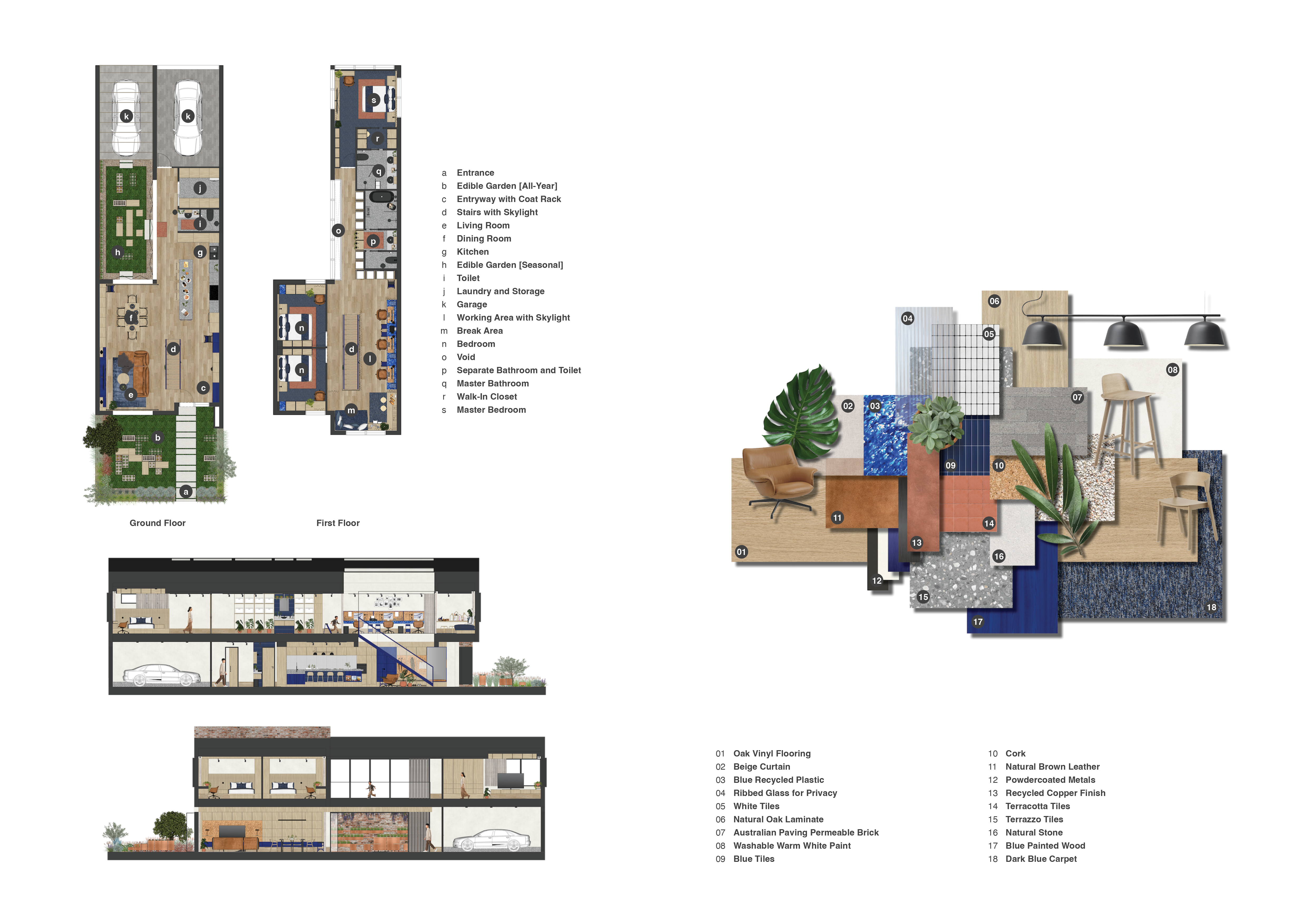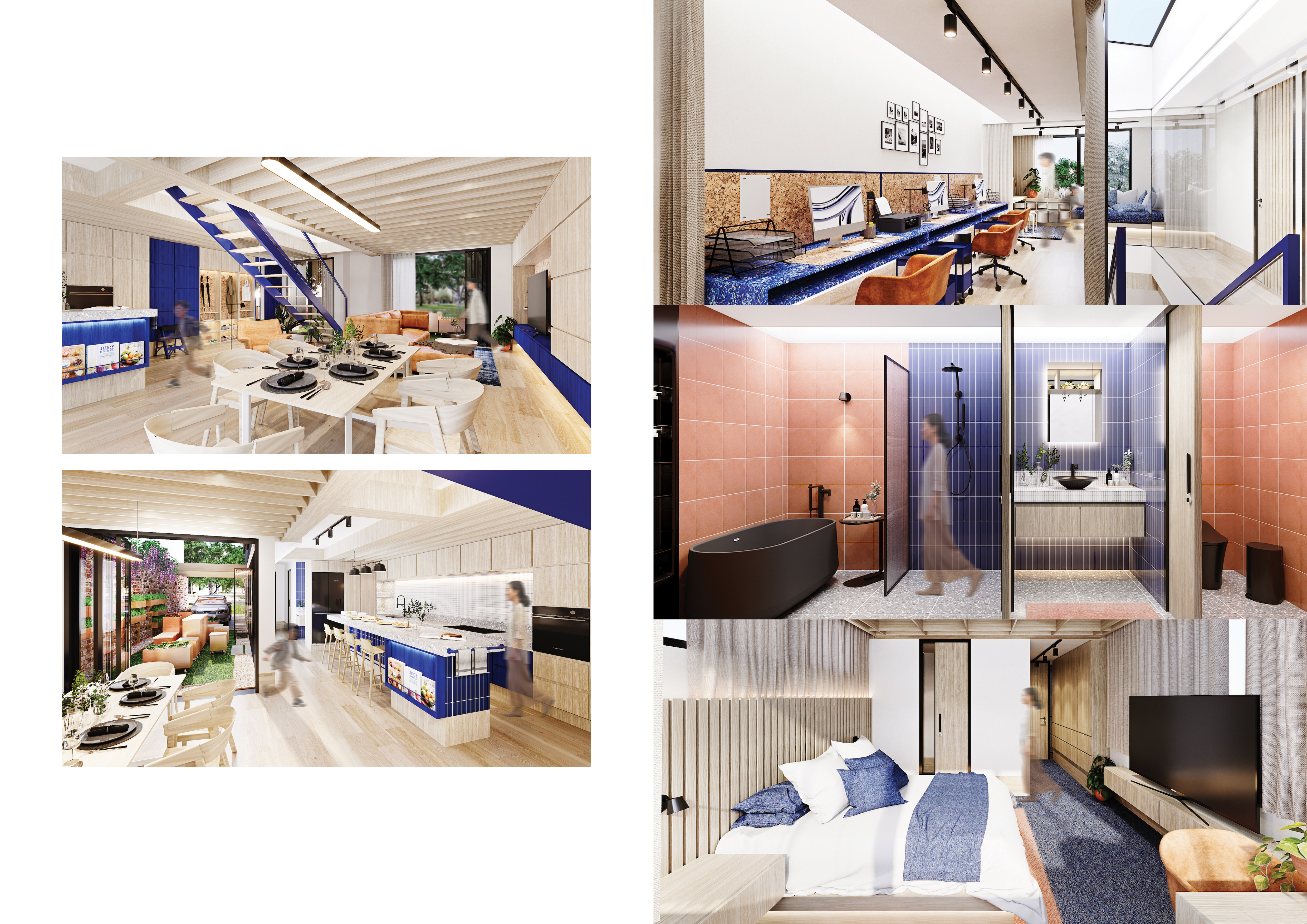 Maker House is designed for hybrid-working graphic designer parents with a young child and occasional elderly visitors. The ground floor seamlessly connects public and semi-public areas like the living room, kitchen, and dining room, fostering social interaction. The kitchen, designed for efficiency and fresh produce use, supports a seamless cooking journey from garden to table. On the first floor, semi-private areas are defined by curtains and modular storage, optimising natural light and productivity. The material palette incorporates warm tones and contrasting blues, blending durability with aesthetic appeal.